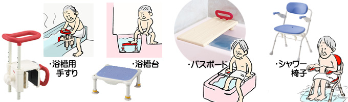 ・高さ調整付き浴槽手すり ・軽量浴槽台 ・バスボード ・シャワー椅子